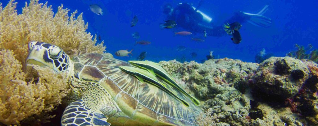 As coral reefs and underwater walls in Siquijor island are connected to the island, you can enjoy great scuba diving from shore or beach. Access at many locations, specially during high tide is easy. If you enjoy relaxed surface time between dives in a shadow of palm trees and slowly preparing for the next dive, this type of diving is what you are searching for. Our practice to dive in small groups or buddy teams with equal or similar level of Scuba diving skills give our customers full diving enjoyment. Our house reef and Marine Sanctuaries close by offer divers diving experiences on walls, coral gardens abundant with sea critters i.e. frog fish, barracudas, porcelan crabs, shrimps… Turtles (Hawksbill and Green turtles) are among them seen on almost every dive and observing them during resting or feeding time is a life time experience. What add additional value to diving on our house reef is easy entry/exit even in a low tide and excellent diving conditions for night dives.